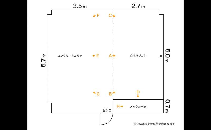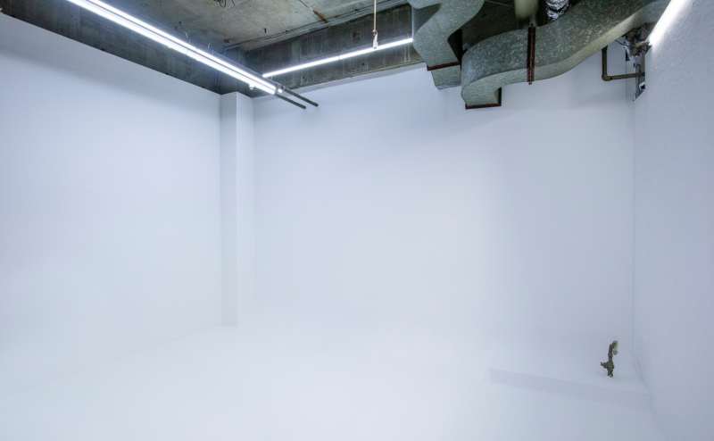 白ホリゾント床面には、汚れ防止のため養生シートを敷いております。養生シート取り除いての撮影も可能ですが、汚れにより再塗装が必要となった場合には、塗装費用として5,000円をご利用料金に加算させて頂きますので予めご了承ください。また撮影用靴には裏張りをお願いいたします。
