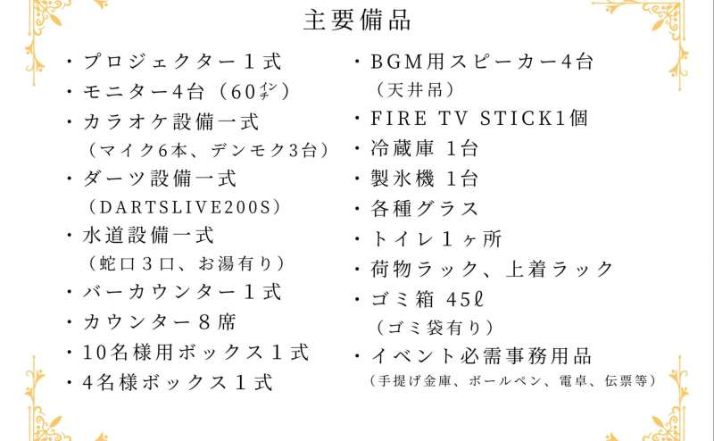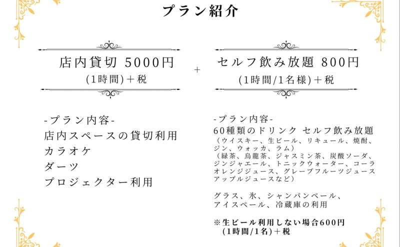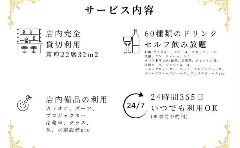 ■18時-5時のご利用は飲み放題(オプション)をご利用頂ける方のみにお貸出をしております。(要相談)