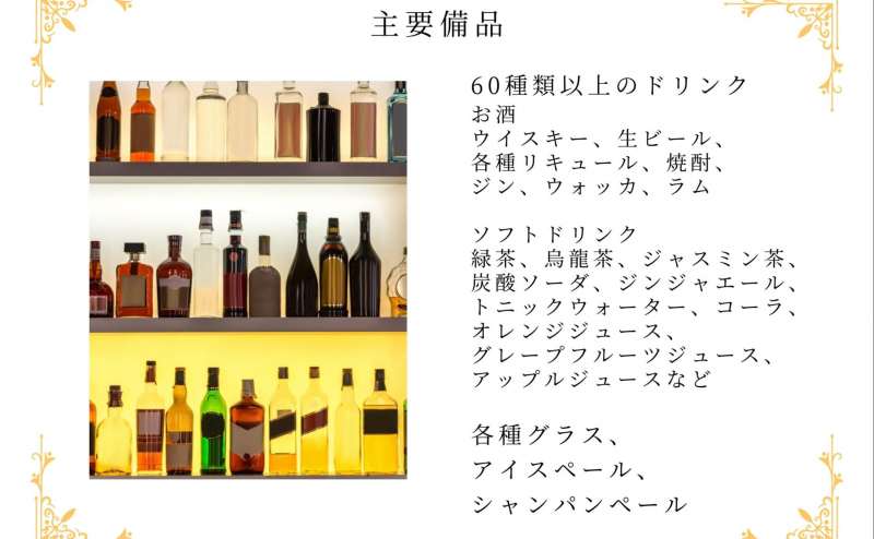 ・オプション選択で店内のドリンク、グラス、氷、冷蔵庫の利用可能。
