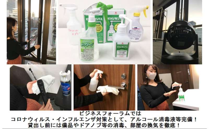 アルコール消毒液等完備、貸出し前には備品やドアノブ等の消毒、部屋の換気を徹底、レイアウトもお気軽にご相談ください。