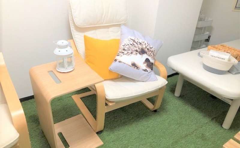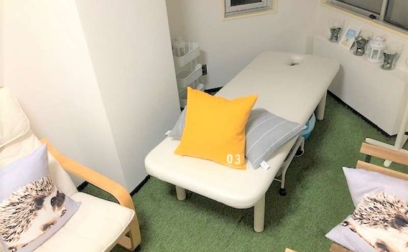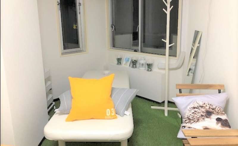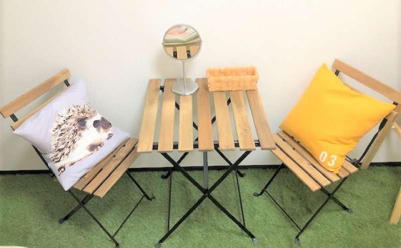 【設備】エステベッド(有孔)、リラックスチェア(ネイルなどでご利用いただけます)×2、サイドテーブル×1、ガーデンテーブル×1、ガーデンチェア×2、エアコン、トイレ、冷蔵庫