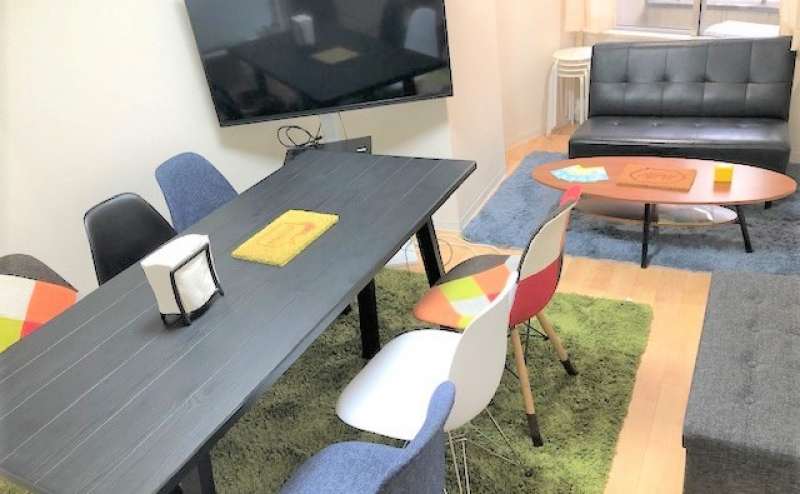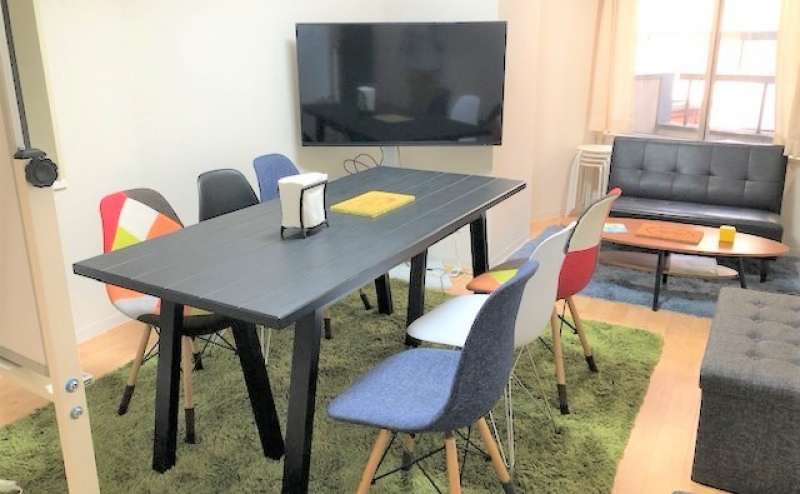 【設備】テーブル(170cm×80cm)×1、イームズチェア×6、コーヒーテーブル×1、2人掛けソファ×1、スツール×4、エアコン、トイレ、冷蔵庫