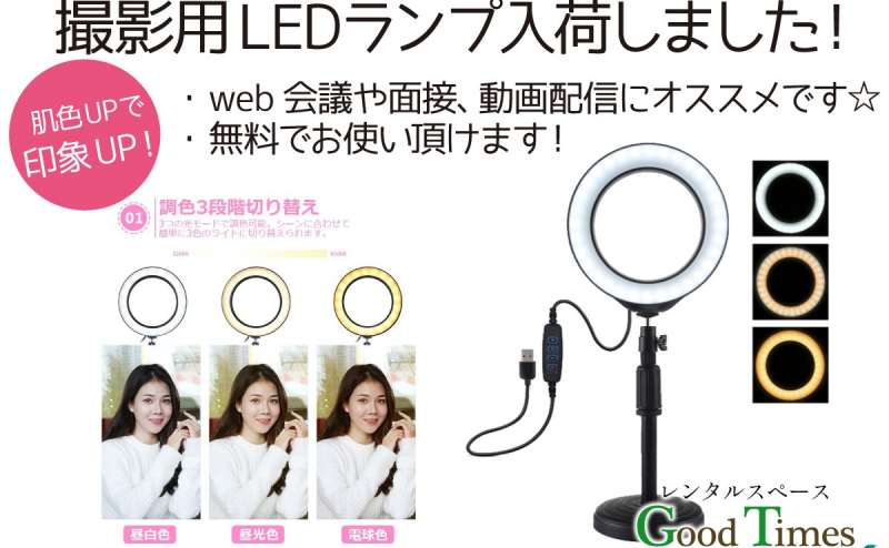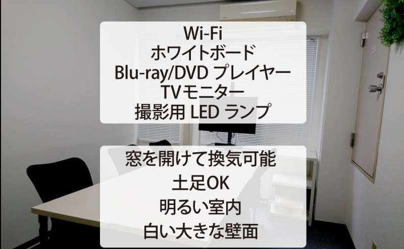 光回線(Wi-Fi有)、ホワイトボード、PC接続モニター、Blu-rayレコーダー、スマホ用充電器、撮影用LEDランプ