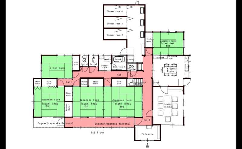 ※布団が24セット、ソファーベッドが1セット、寝具は合わせて25名様分迄のご準備となります。広さ的には寝室だけで54畳ありますので、26名様以上でも滞在可能ですが、人数は必ず事前にご相談下さいませ。