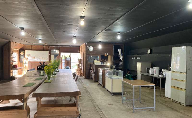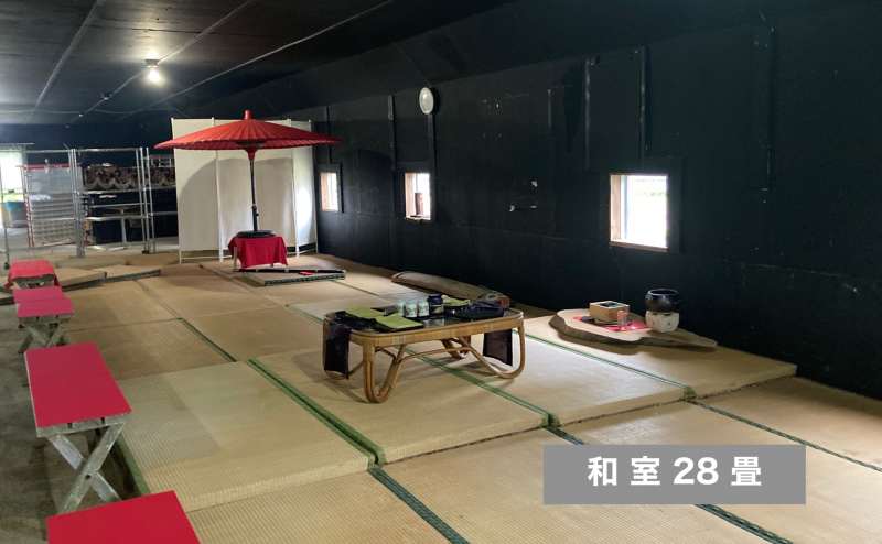 100坪のスペースに大型テーブル、畳28畳、展示スペース、ピアノ、個室2部屋など有り
