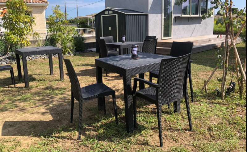 キッチン棟の前にある開放的なアウトドアカフェ。