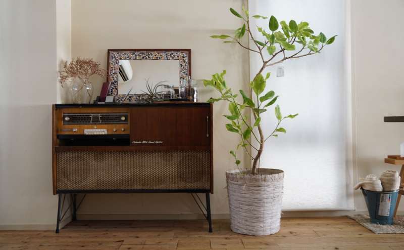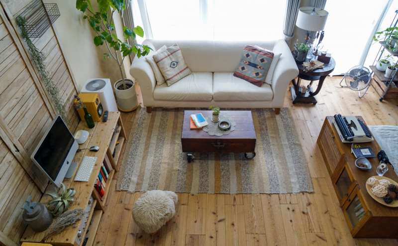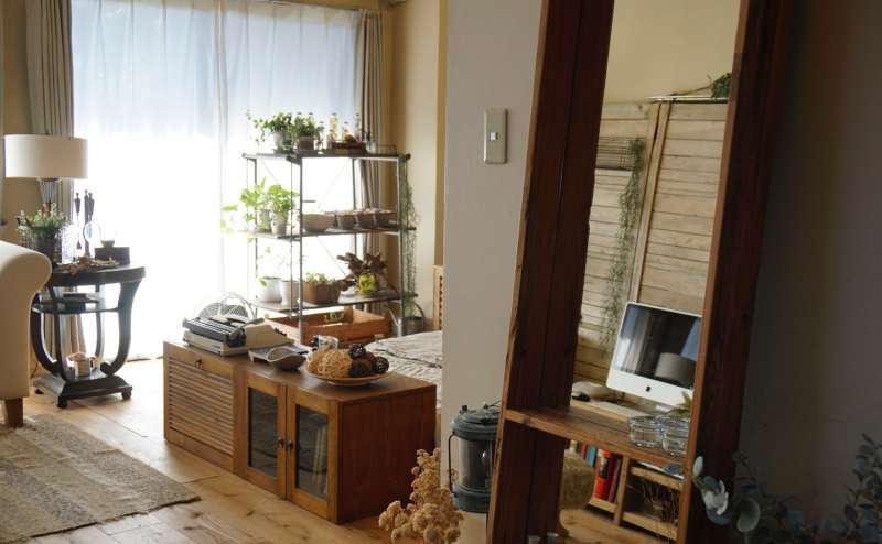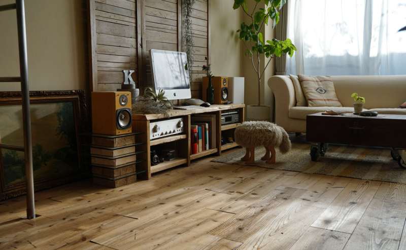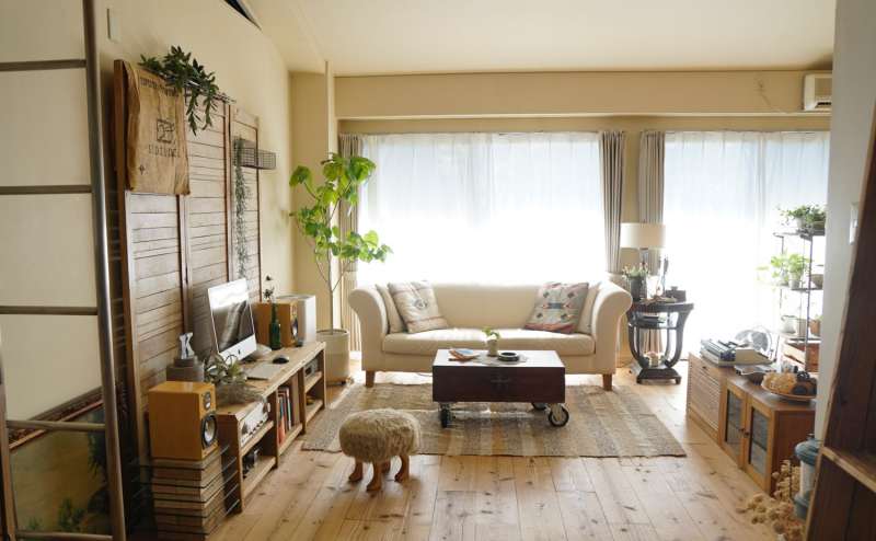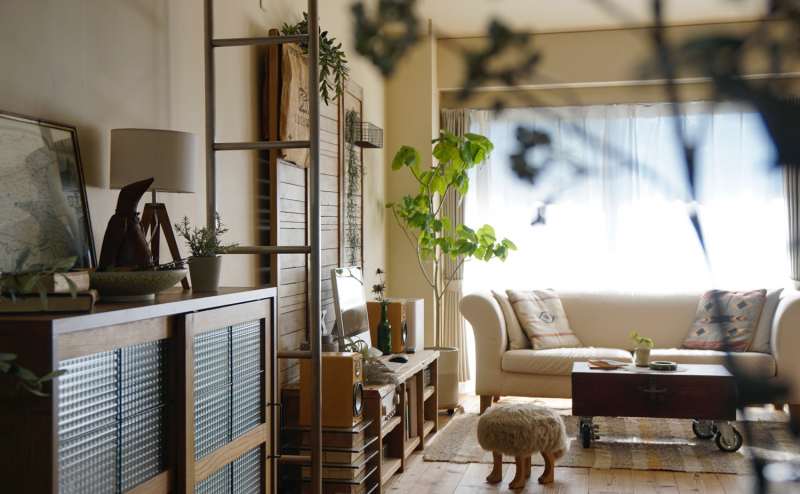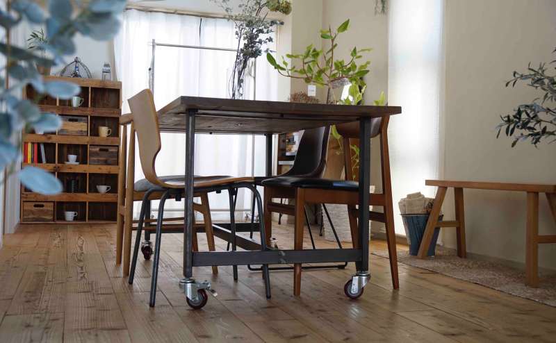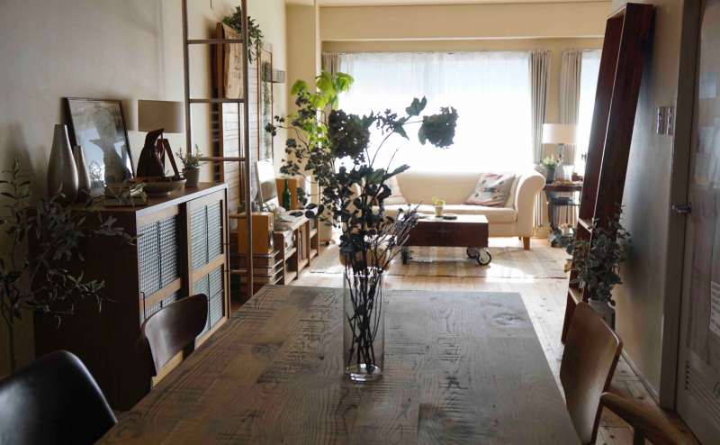 天窓から射す自然光が、個性的な家具や小物を照らし、床には錆びたフローリング。