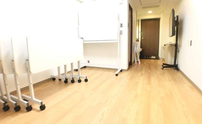 ⇒テーブルを折り畳んで簡単に移動、椅子は積み重ね可能、土足ではないためフロアを使った実技も可能です