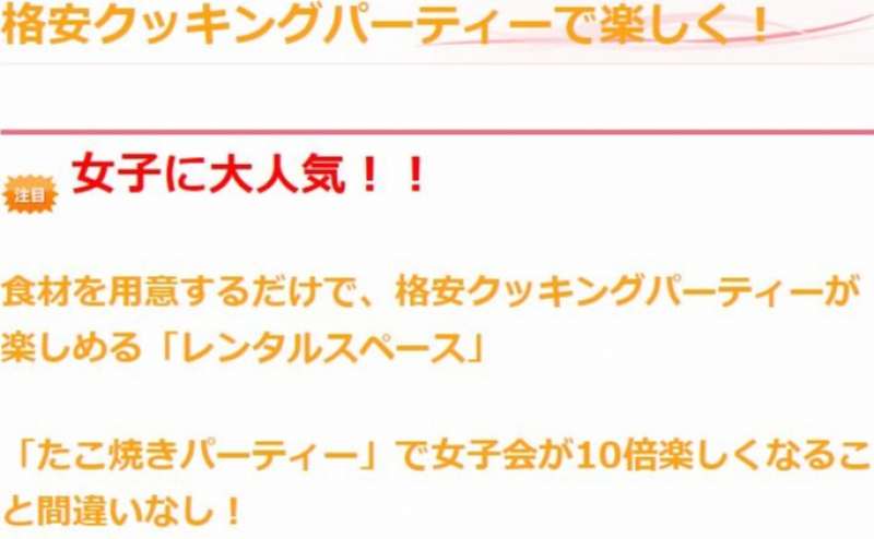 リーズナブルにピザ等宅配。 ファミレス宅配。 手作り料理、スーパーの惣菜。 本格的ケータリング、手ぶらクッキングパーティーまで、お酒飲食もできるので気軽に楽しめます。 格安利用料で浮いた費用を食費にまわして贅沢にも楽しめる!