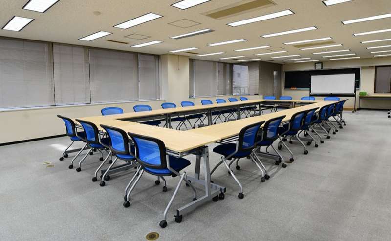 テーブルが21台あります。広々とお使いいただけるのでアイランド形式やスクール形式などレイアウトの自由度が高く、様々な用途にご利用頂けます。