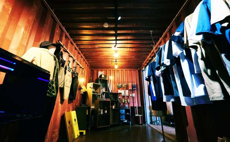 工場内に設置してあるコンテナはアパレル&雑貨ショップとして営業しておりますので、その什器を利用して商品撮影も可能です。