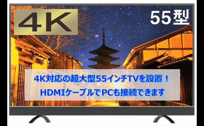 室内にはパソコンから外部モニターとしてHDMIケーブルで接続できる4K対応大型液晶テレビ(55インチ)、高速光Wi-Fi、ホーロー製壁掛けホワイトボード(幅180cm×高さ90cm)を設置していますのでご自由にお使い下さい。 (全長5mのHDMIケーブルを常設、テレビに接続しています)