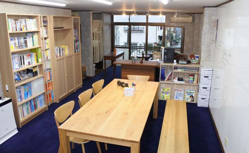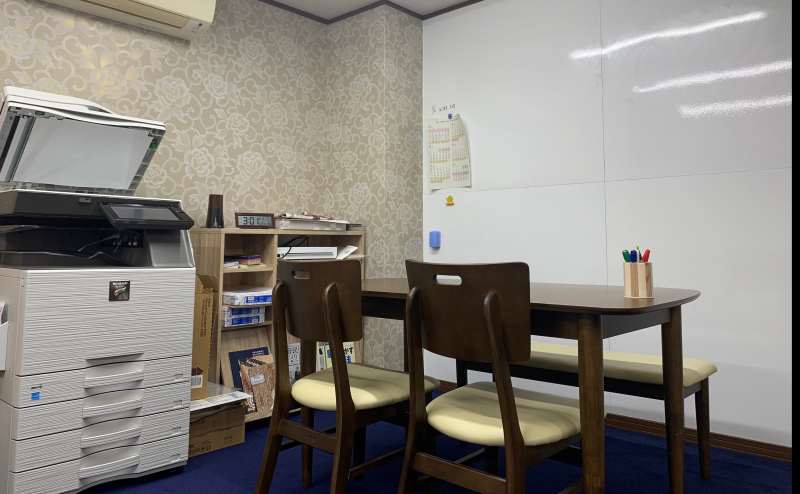 リビング風のレンタルスペース。壁が全面ホワイトボードなので、少人数の会議やセミナー・教室などに適しています。ダイニングテーブル3台、机6台、イス21脚、ベンチ1脚、カフェテーブル1台、ソファ1脚等は備品として使用可(無料)。壁全面のホワイトボードおよびマーカーも使用可(無料)。有料で、コピー複合機、文具類、キッチン用品、食器類も利用できます。いずれも事前にお申込みください。場所は、JR・地下鉄東西線二条駅から徒歩5分。3階建ての2階部分です。