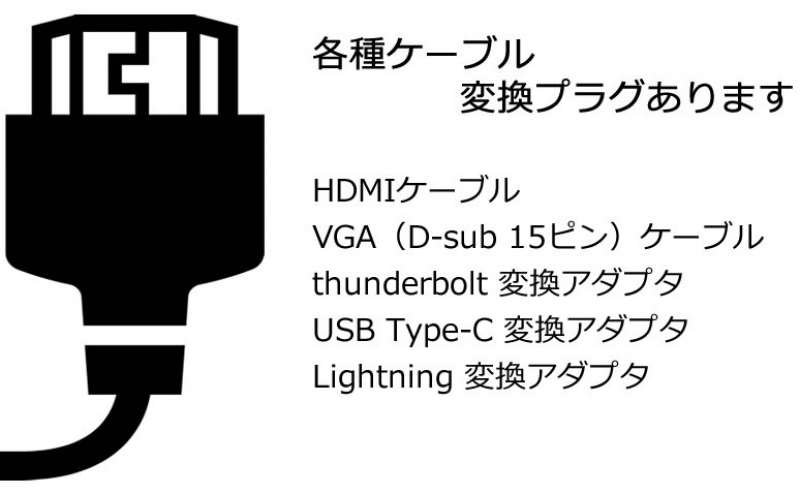 全てのレンタルスペースにHDMI,VGAケーブル、thunderbolt,USB Type-Cの変換プラグがございます。