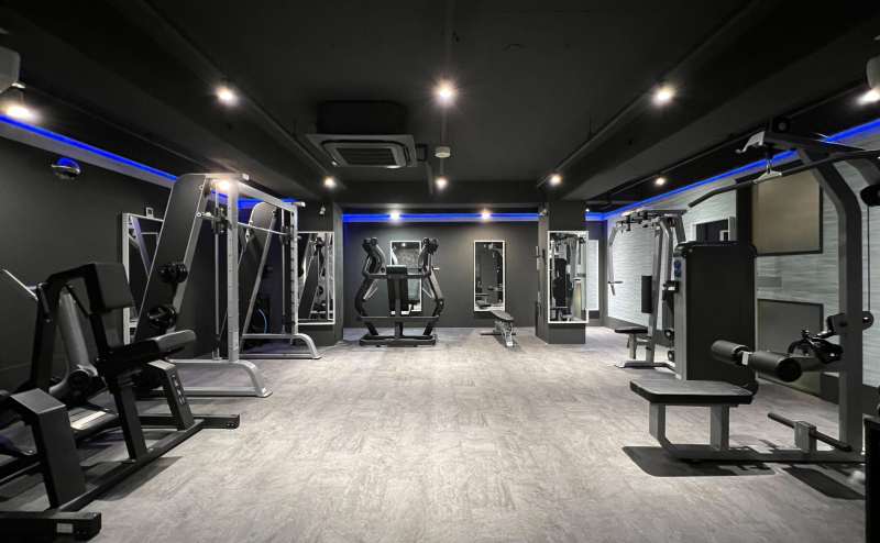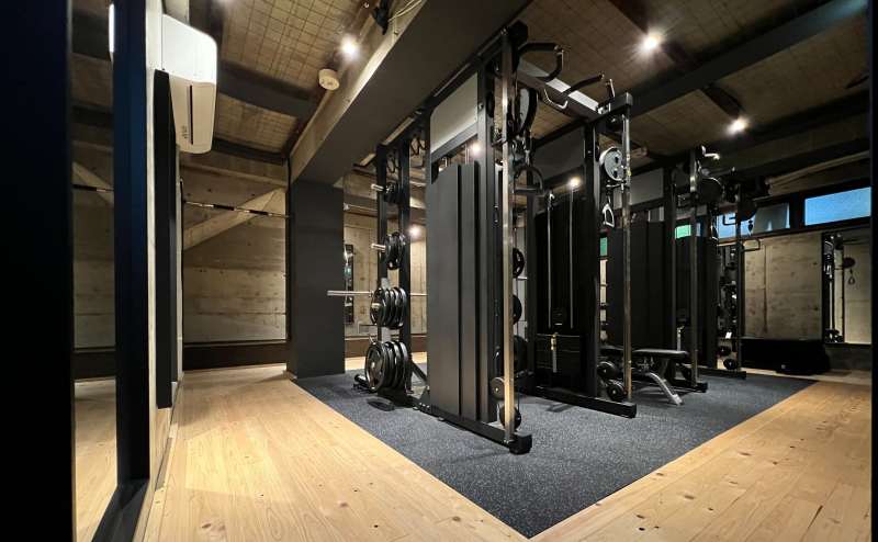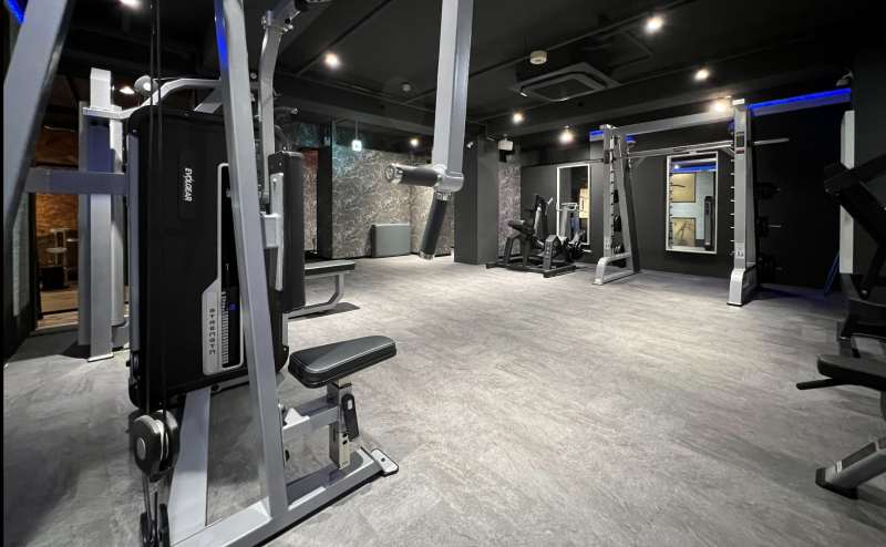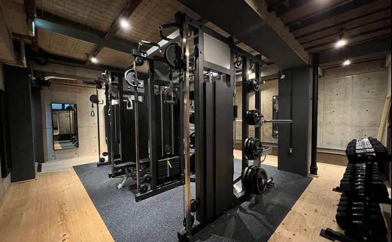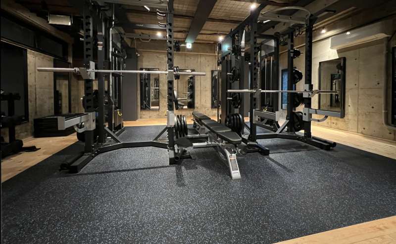 150㎡空間にラットプルダウン、チェストプレス、ロウイング、ロングプル、フライ、リアデルト、スミスマシン、パワーラック2台、ケーブル2台、ダンベル25kgまで豊富な設備を取り揃えています。