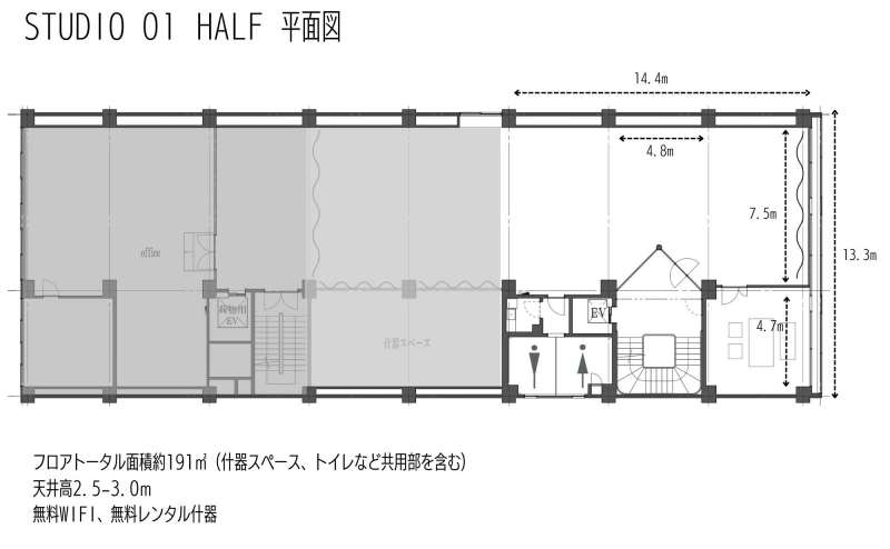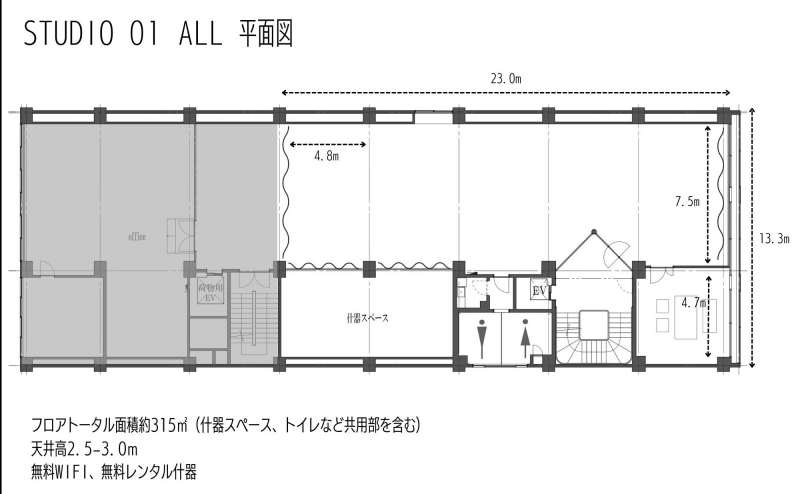 トータル面積315㎡という圧倒的なスペースの広さと、豊富な設備・什器を取り揃えており、