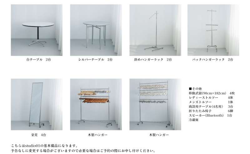 ・スタジオ内の仕様(壁・床・家具等)は、予告なしに変更する場合がございますので、ご予約の際にご確認くださいませ。