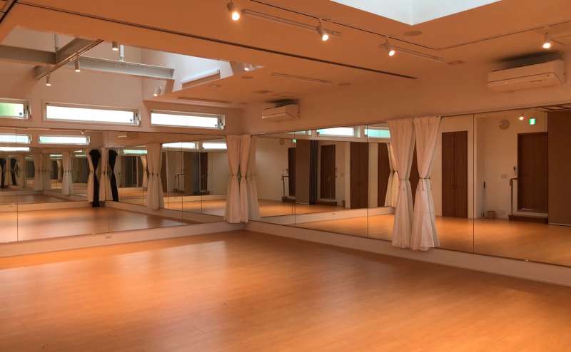 ①天井吹抜け広々空間で天井が高く使いやすいスタジオ②いわき湯本インター10分、常磐線湯本駅徒歩10分、③前鏡、横鏡、Bluetoothスピーカー、広さ6メートル×5メートル×高さ2メートル90+吹抜け