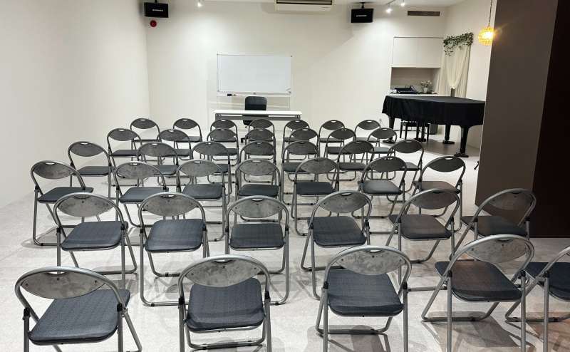 椅子・テーブル・スクリーン完備。配信対応Wi-Fiあり。